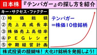 株 【日本株】株価10倍!!テンバガー銘柄の探し方 投資家であれば誰しもが夢を見るテンバガー(株価10倍)銘柄の探し方を動画にしました。一生懸命調べた銘柄が成長していく様は見ていて本当に嬉しくなります。そこにはデイトレやスイングトレードでは味わえない喜びがあります。今回、動画にした内容は実際... 2026.03.23 株