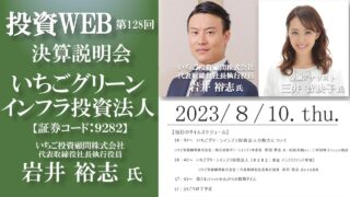 株 【Live・投資WEB】いちごグリーンインフラ投資法人の説明<決算WEBセミナー>|ゲスト講師:和島英樹さん MC:三井智映子さん《第128回》 今回は、いちごグリーンインフラ投資法人(9282:東証 インフラファンド市場)さまが、8月10日(木)に決算発表を行い、その内容をLive配信する<決算WEBセミナー>です。セミナー冒頭は、いちごグリーンの運用の責任者である、いちご投資顧問... 2026.04.09 株