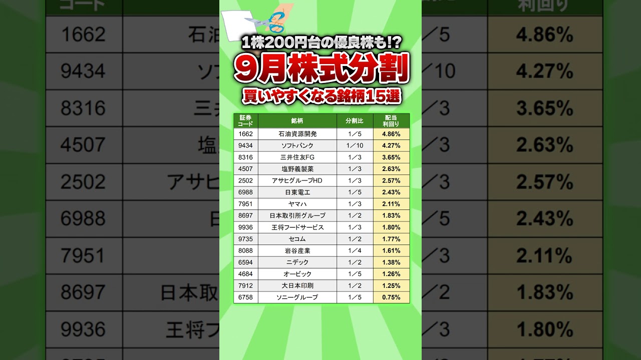 【1株200円も!?】9月に株式分割する銘柄15選 #高配当 #投資 #配当 株 X Facebook はてブ Pocket LINE コピー 2025.09.30 この動画について URL https://www.youtube.com/watch?v=fGFMRLV9brA 動画ID fGFMRLV9brA 投稿者 ためかぶ 再生時間 00:12