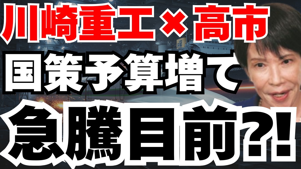 【動画概要】高市早苗新総裁誕生で防衛費がGDP比2%(10兆円規模)へ増額確定!川崎重工は潜水艦・大型輸送機で技術的独占力を持ち、現在株価9,937円から目標12,000円~13,500円への+25~36%上昇が期待される防衛株の本命銘柄に。