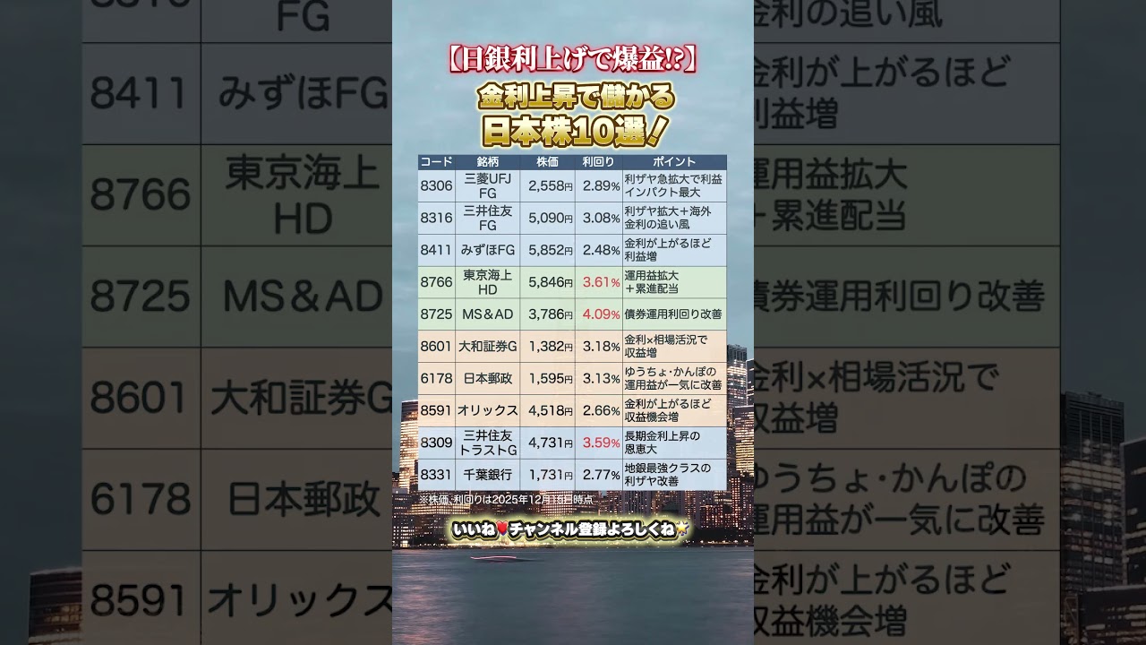 💡 高配当だけでなく、利上げによる業績改善期待も重視しています。