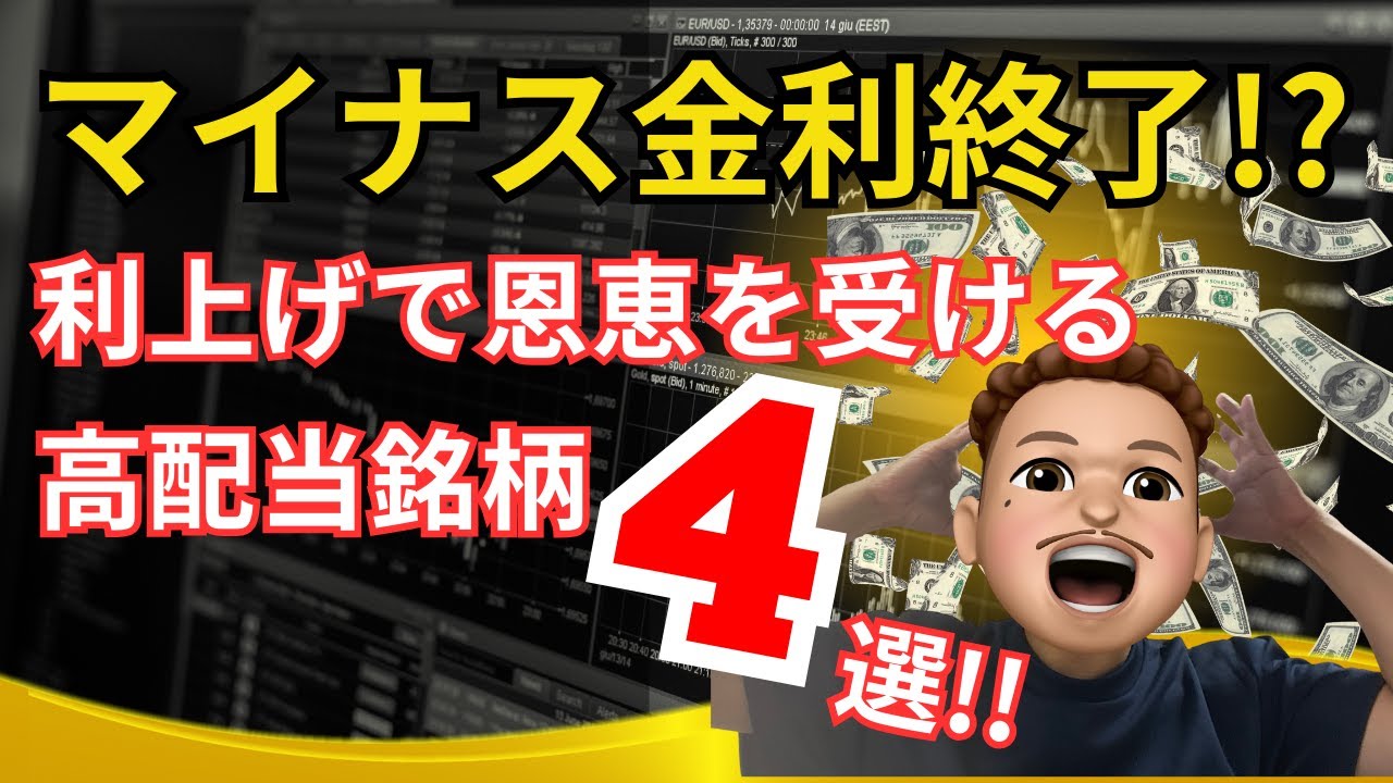いつもご視聴いただきありがとうございます。最近巷を騒がしている政策金利変更で恩恵を受けるであろう銘柄を4つ紹介します!!