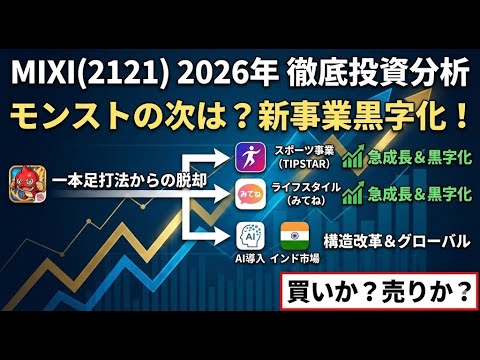 【動画の概要】 本動画では、株式会社MIXI(ミクシィ/証券コード:2121)の2026年に向けた投資分析を徹底的に行います。長年「モンスターストライク(モンスト)」という巨大なキャッシュカウに支えられてきた同社ですが、投資家が最も懸念している「モンストの次はあるのか?」という問いに対し、現在の経営数値と事業戦略をもとに明確な答えを探っていきます。