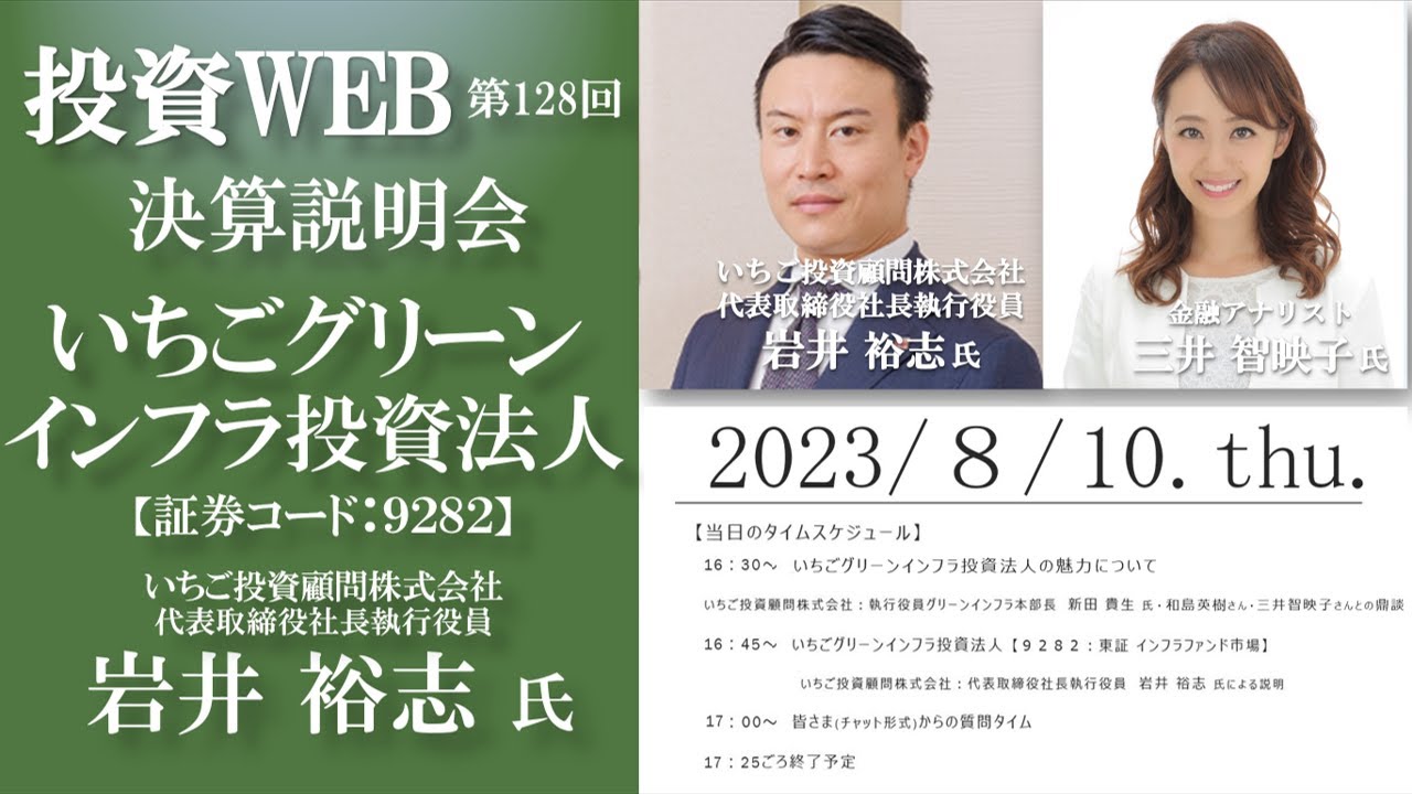 今回は、いちごグリーンインフラ投資法人(9282:東証 インフラファンド市場)さまが、8月10日(木)に決算発表を行い、その内容をLive配信する<決算WEBセミナー>です。