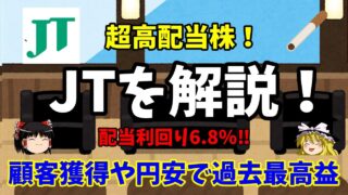 株 【配当利回り6.7% JTを解説】顧客獲得や円安の影響で過去最高益&増配 高配当株銘柄としてまず候補に上がるJTを解説します。近年は海外進出、医療、食料分野にも進出しており、海外の業績が重要になってきています。高配当株投資としておすすめ銘柄としての紹介です。動画で伝えきれなかった詳しい内容は下記のブログで説明して... 2026.01.28 株